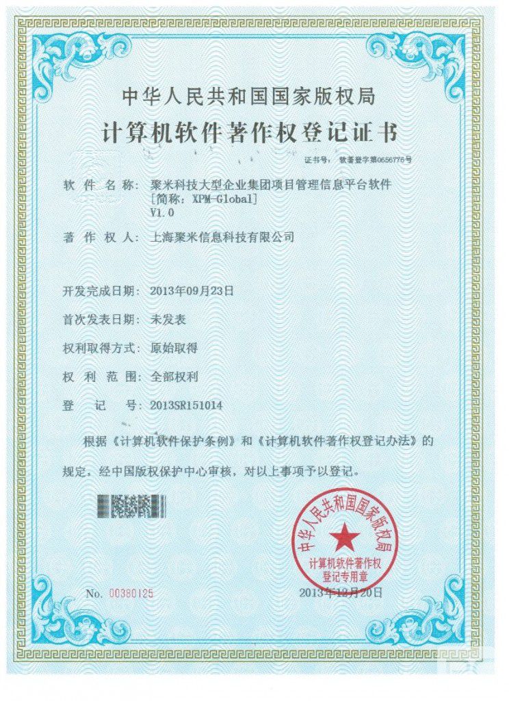 近日,《聚米科技大型企業(yè)集團(tuán)項目管理信息平臺軟件》、《聚米科技房地產(chǎn)項目運營管理平臺軟件》、《聚米科技企業(yè)級項目組合管理系統(tǒng)軟件》、《聚米科技在線項目管理軟件》四項軟件著作權(quán)獲得中華人民共和國國家版權(quán)局認(rèn)可并頒發(fā)證書。這是聚米科技在知識產(chǎn)權(quán)建設(shè)中的又一有力舉措。聚米一直致力于為全球客戶提供卓越的項目管理咨詢服務(wù)和專業(yè)的IT解決方案,在行業(yè)內(nèi)一直保持著領(lǐng)先地位。